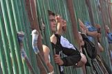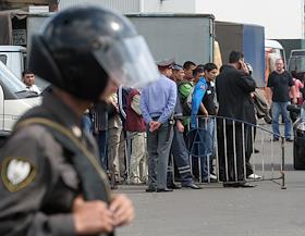 Иностранные рабочие стоят за забором на рынке "Евразия" - часть Черкизовского рынка, который расположен по адресу Сиреневый бульвар, дом 2. На рынке произошел взрыв в 10.35 утра, сработало безоболочное взрывное устройство, погибли десять человек, среди них двое детей, 31 человек доставлен в больницу. В результате взрыва обрушились конструкции на площади 200 квадратных метров. Возбуждено уголовное дело по статье убийство.