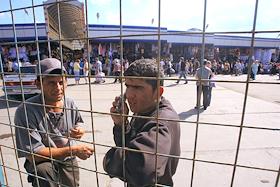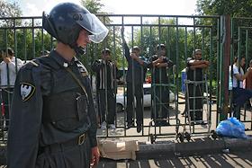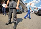 Иностранные рабочие стоят за забором на рынке "Евразия" - часть Черкизовского рынка, который расположен по адресу Сиреневый бульвар, дом 2. На рынке произошел взрыв в 10.35 утра, сработало безоболочное взрывное устройство, погибли десять человек, среди них двое детей, 31 человек доставлен в больницу. В результате взрыва обрушились конструкции на площади 200 квадратных метров. Возбуждено уголовное дело по статье убийство.