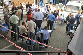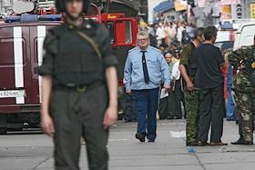 Прокурор Москвы Юрий Семин (в центре) на месте взрыва на рынке "Евразия" - часть Черкизовского рынка, который расположен по адресу Сиреневый бульвар, дом 2. Взрыв произошел в 10.35 утра, сработало безоболочное взрывное устройство, погибли десять человек, среди них двое детей, 31 человек доставлен в больницу. В результате взрыва обрушились конструкции на площади 200 квадратных метров. Возбуждено уголовное дело по статье убийство.