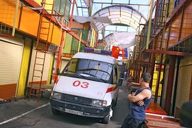 Автомобиль скорой медицинской помощи на месте взрыва на рынке "Евразия" - часть Черкизовского рынка, который расположен по адресу Сиреневый бульвар, дом 2. Взрыв произошел в 10.35 утра, сработало безоболочное взрывное устройство, погибли десять человек, среди них двое детей, 31 человек доставлен в больницу. В результате взрыва обрушились конструкции на площади 200 квадратных метров. Возбуждено уголовное дело по статье убийство.