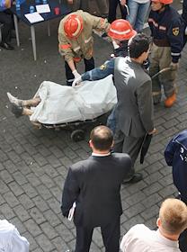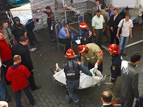 Сотрудники службы МЧС увозят труп человека, погибшего при взрыве на рынке "Евразия" - часть Черкизовского рынка, который расположен по адресу Сиреневый бульвар, дом 2. Взрыв произошел в 10.35 утра, сработало безоболочное взрывное устройство, погибли десять человек, среди них двое детей, 31 человек доставлен в больницу. В результате взрыва обрушились конструкции на площади 200 квадратных метров. Возбуждено уголовное дело по статье убийство.