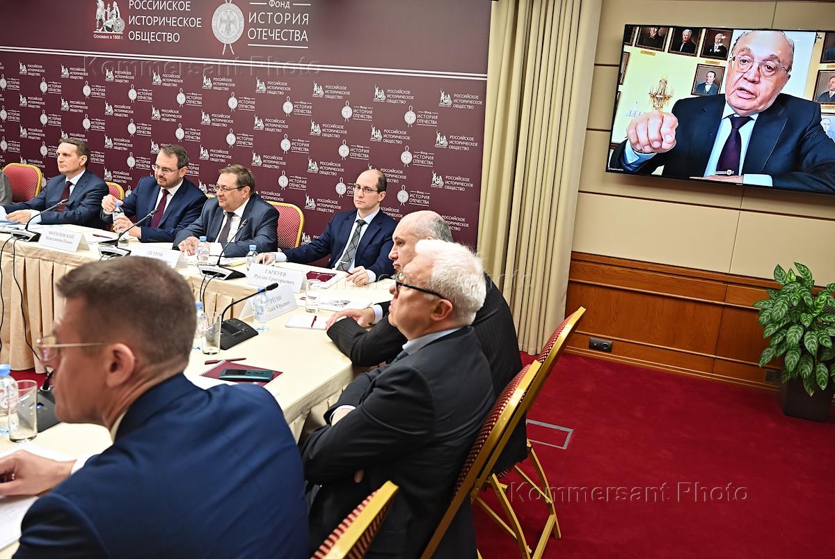Заседание "круглого стола" об истории Севастополя и его месте в истории России, приуроченное к девятой годовщине воссоединения Крыма и Севастополя с Россией в Доме Российского исторического общества. Слева направо: советский и российский археолог и историк, академик Российской академии наук, директор Института археологии РАН Николай Макаров, представитель в Совете Федерации России от законодательного (представительного) органа государственной власти города Севастополя Екатерина Алтабаева, председатель Российского исторического общества Сергей Нарышкин и заместитель министра науки и высшего образования Константин Могилевский во время заседания.
