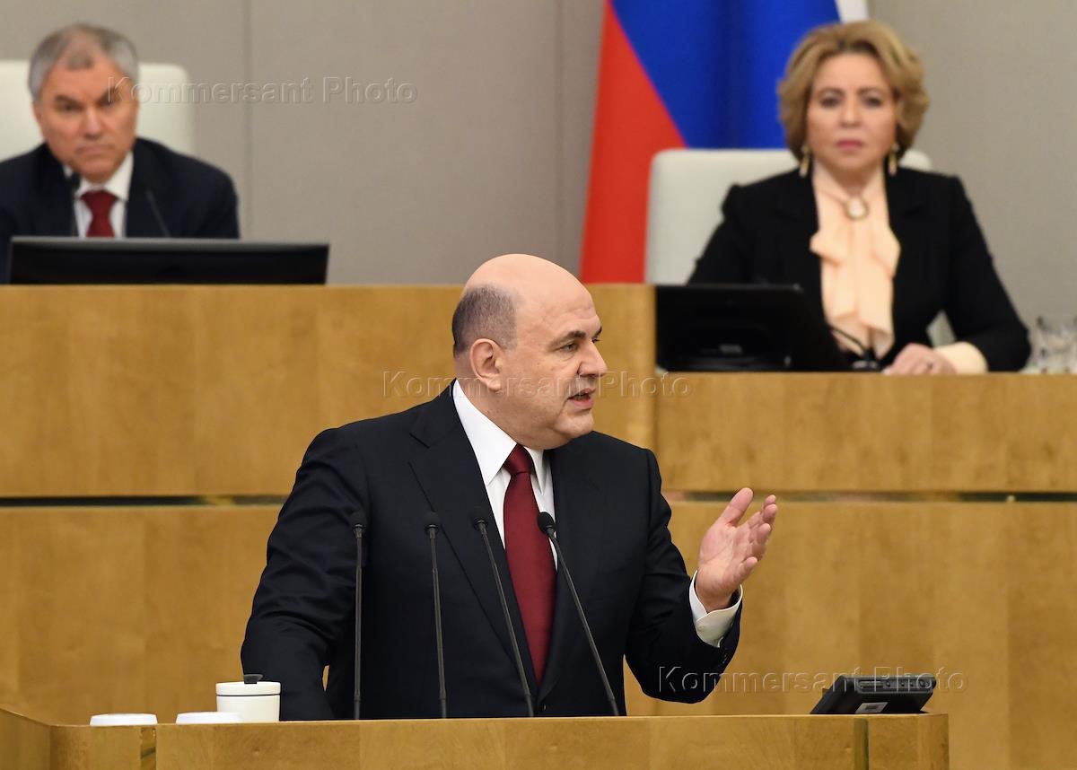 Plenary session of the State Duma of Russia. From left to right: Prime Minister of Russia Mikhail Mishustin, Chairman of the State Duma of Russia Vyacheslav Volodin and Chairman of the Federation Council of Russia Valentina Matviyenko during the meeting.