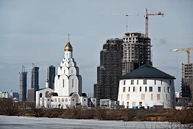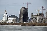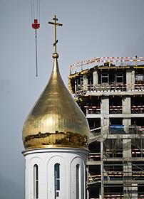 Виды Москвы. Жилищное строительство на территории бывшего Тушинского аэродрома. Жанровая фотография. Купол церкви в честь святого равноапостольного великого князя Владимира (Владимирской церкви) на фоне строящегося жилого комплекса "Клубный город на реке Primavera".