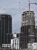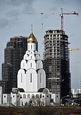 Виды Москвы. Жилищное строительство на территории бывшего Тушинского аэродрома. Жанровая фотография. Церковь в честь святого равноапостольного великого князя Владимира (Владимирская церковь) на фоне строящегося жилого комплекса "Клубный город на реке Primavera".