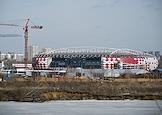 Виды Москвы. Строительство на территории бывшего Тушинского аэродрома. Жанровая фотография. Стадион "Открытие банк Арена" и строительные краны. Берег Москвы-реки.