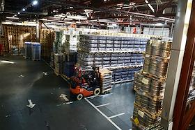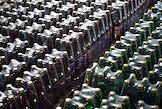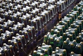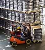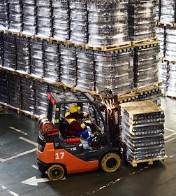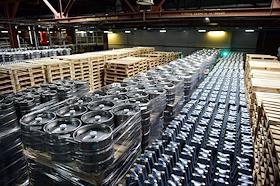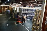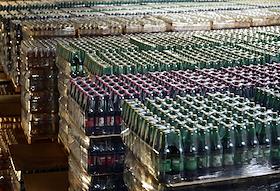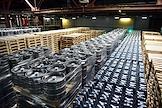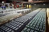 Новосибирский завод АО "АБ ИнБев Эфес" (AB InBev Efes) по производству пива. Церемония запуска пивоваренной компания AB InBev Efes совместно с производителем стеклотары "Сибстекло" первую в России производственную линию пива в сверхлегкой стеклянной бутылке. Жанровая фотография. Склад готовой продукции.