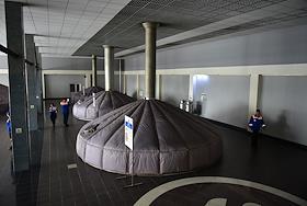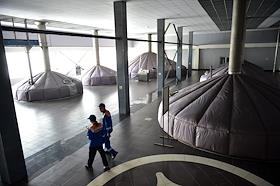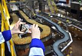 Новосибирский завод АО "АБ ИнБев Эфес" (AB InBev Efes) по производству пива. Церемония запуска пивоваренной компания AB InBev Efes совместно с производителем стеклотары "Сибстекло" первую в России производственную линию пива в сверхлегкой стеклянной бутылке. Жанровая фотография. Цех с емкостями для сбраживания пива.
