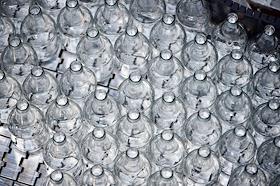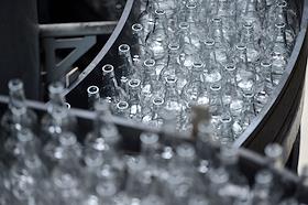 Новосибирский завод АО "АБ ИнБев Эфес" (AB InBev Efes) по производству пива. Церемония запуска пивоваренной компания AB InBev Efes совместно с производителем стеклотары "Сибстекло" первую в России производственную линию пива в сверхлегкой стеклянной бутылке. Жанровая фотография. Конвейер с пустыми бутылками для разлива пива на ленте.
