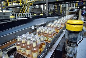 Новосибирский завод АО "АБ ИнБев Эфес" (AB InBev Efes) по производству пива. Церемония запуска пивоваренной компания AB InBev Efes совместно с производителем стеклотары "Сибстекло" первую в России производственную линию пива в сверхлегкой стеклянной бутылке. Жанровая фотография. Конвейер с упаковками бутылок пива "Старый мельник" на ленте.