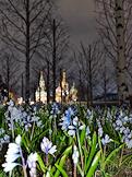 Виды Москвы. Ландшафтный парк "Зарядье". Цветы подснежники на клумбе парка.