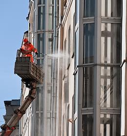 Виды Москвы. Большая Никитская улица. Жанровая фотография. Рабочий моет фасад жилого дома.
