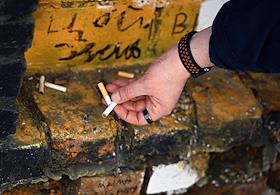 Виды Москвы. Улица Арбат. Жанровая фотография. Оставленные надломленные сигареты у стены памяти лидера группы "Кино" Виктора Цоя на Арбате.