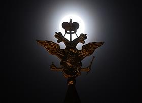 Жанровая фотография. Двуглавый орел на здании Государственного Исторического музея на фоне полной луны.