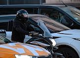 Жанровая фотография. Мужчина на мотоцикле среда автомобилей на дороге.