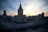 Виды Москвы. Жанровая фотография. Высотное здание гостиницы "Ленинградская" на Каланчевской улице и электричка на железнодорожном мосту в районе Комсомольской площади.