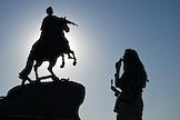 Виды Санкт-Петербурга. Жанровая фотография. Девушка возле памятника первому российскому императору Петру Великому "Медный всадник" на Сенатской площади.