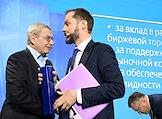 VII Ежегодный международный форум Санкт-Петербургской международной товарно-сырьевой биржи (СПбМТСБ) "Биржевой товарный рынок-2023" в конгресс-центре Double Space. Заместитель министра энергетики России Анатолий Яновский (слева) и заместитель руководителя ФАС России Виталий Королев (в центре) на форуме.