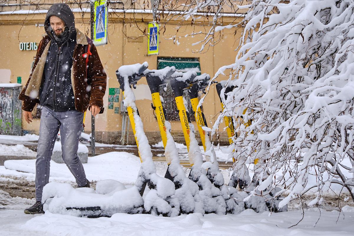 Жанровая фотография. Снегопад в городе. Стоянка проката электросамокатов. Мужчина идет на улице под снегопадом.