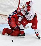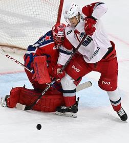 Continental Hockey League (KHL). Championship season 2022/23. Match between the teams of CSKA (Moscow) - "Lokomotiv" (Yaroslavl) at the stadium "CSKA Arena". Lokomotiv team player Maxim Beryozkin (right) and CSKA team goalkeeper Adam Reideborn (left) during the match.