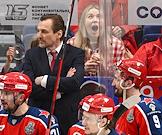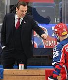 Continental Hockey League (KHL). Championship season 2022/23. Match between the teams of CSKA (Moscow) - "Lokomotiv" (Yaroslavl) at the stadium "CSKA Arena". CSKA head coach Sergei Fedorov (center) during the match.