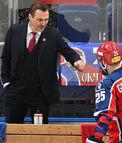 Continental Hockey League (KHL). Championship season 2022/23. Match between the teams of CSKA (Moscow) - "Lokomotiv" (Yaroslavl) at the stadium "CSKA Arena". CSKA head coach Sergei Fedorov (left) and CSKA team player Mikhail Grigorenko (right) during the match.