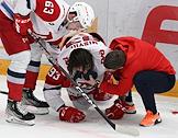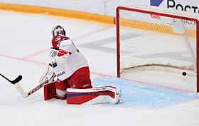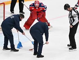 Continental Hockey League (KHL). Championship season 2022/23. Match between the teams of CSKA (Moscow) - "Lokomotiv" (Yaroslavl) at the stadium "CSKA Arena". CSKA goalkeeper Adam Reideborn (center) and the stadium's technical service during the match.