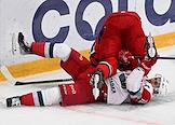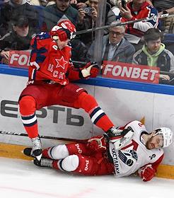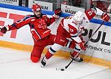 Continental Hockey League (KHL). Championship season 2022/23. Match between the teams of CSKA (Moscow) - "Lokomotiv" (Yaroslavl) at the stadium "CSKA Arena". CSKA team player Fredrik Klasson (left) and Lokomotiv team player Stepan Nikulin (right) during the match.
