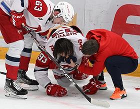 Continental Hockey League (KHL). Championship season 2022/23. Match between the teams of CSKA (Moscow) - "Lokomotiv" (Yaroslavl) at the stadium "CSKA Arena". Lokomotiv team players Pavel Kraskovsky (left) and Daniil Misyul (center) during the match.