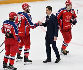 Continental Hockey League (KHL). Championship season 2022/23. Match between the teams of CSKA (Moscow) - "Lokomotiv" (Yaroslavl) at the stadium "CSKA Arena". From left to right: CSKA team players Prokhor Poltapov, Fredrik Klasson, Lokomotiv head coach Igor Nikitin and CSKA team player Sergei Plotnikov after the match.