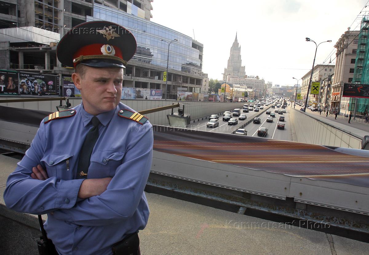День Государственного флага России. Сотрудник милиции во время дежурства на пересечении Садового кольца и улицы Новый Арбат.