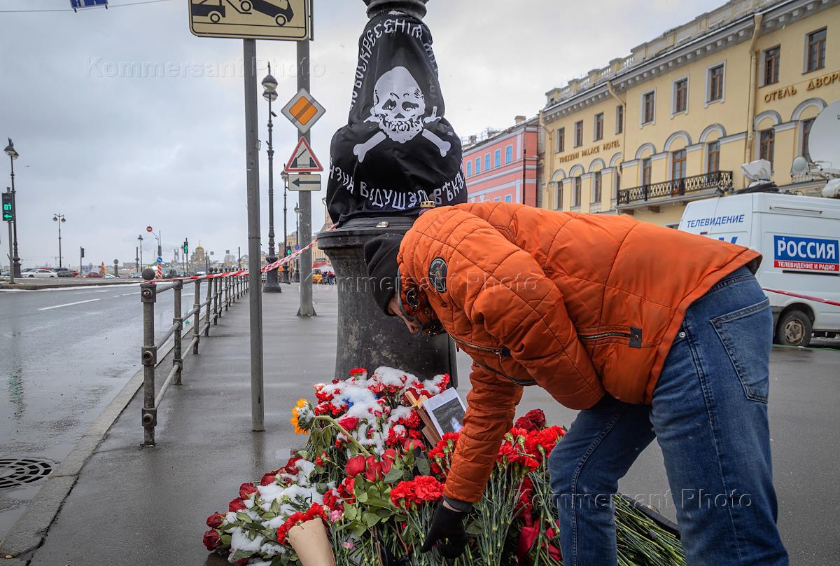 Situation near the cafe "Street-bar" on Universitetskaya embankment, where an explosion occurred during a creative evening of war correspondent Vladlen Tatarsky. Flowers in memory of the deceased war correspondent Vladlen Tatarsky (Maxim Fomin) at the Street Bar cafe.