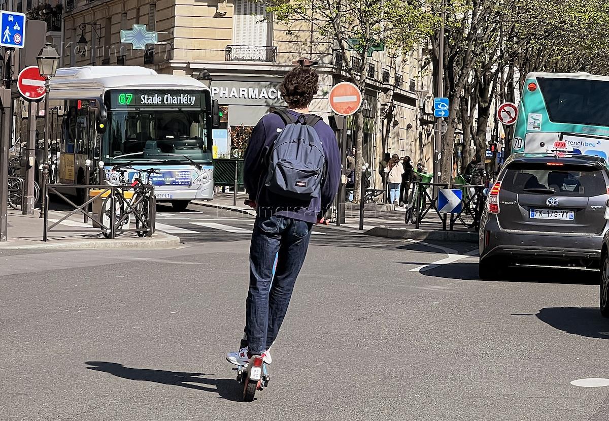 Views of Paris. Genre photography. Young man on a scooter on the roadway.