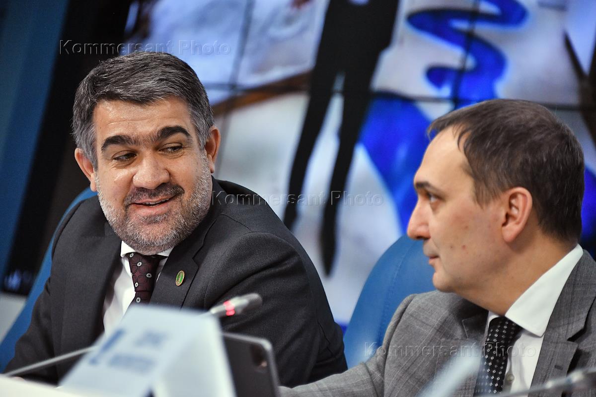 Press conference dedicated to the presentation of the urban environment quality index for 2022, calculated by the Russian Ministry of Construction and the DOM.RF Development Institute, at the TASS press center. Minister of Construction, Housing and Communal Services of the Chechen Republic Muslim Zaipullayev (left) and Deputy CEO of JSC "DOM.RF" Denis Filippov (right) before the press conference.