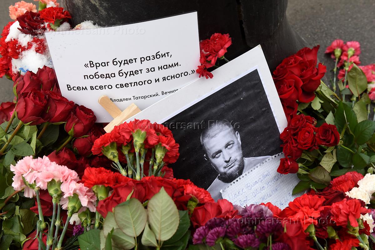 Ситуация у кафе "Стрит-бар" на Университетской набережной, где во время творческого вечера военного корреспондента Владлена Татарского (Максима Фомина) произошел взрыв. Цветы в память о погибшем военном корреспонденте Владлене Татарском у кафе "Стрит-бар".