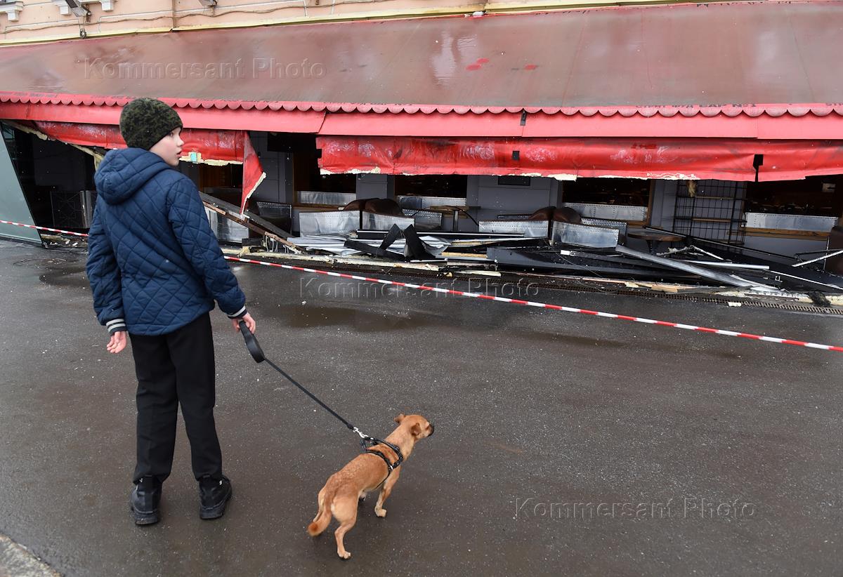 Ситуация у кафе "Стрит-бар" на Университетской набережной, где во время творческого вечера военного корреспондента Владлена Татарского (Максима Фомина) произошел взрыв. Сотрудники полиции у кафе.