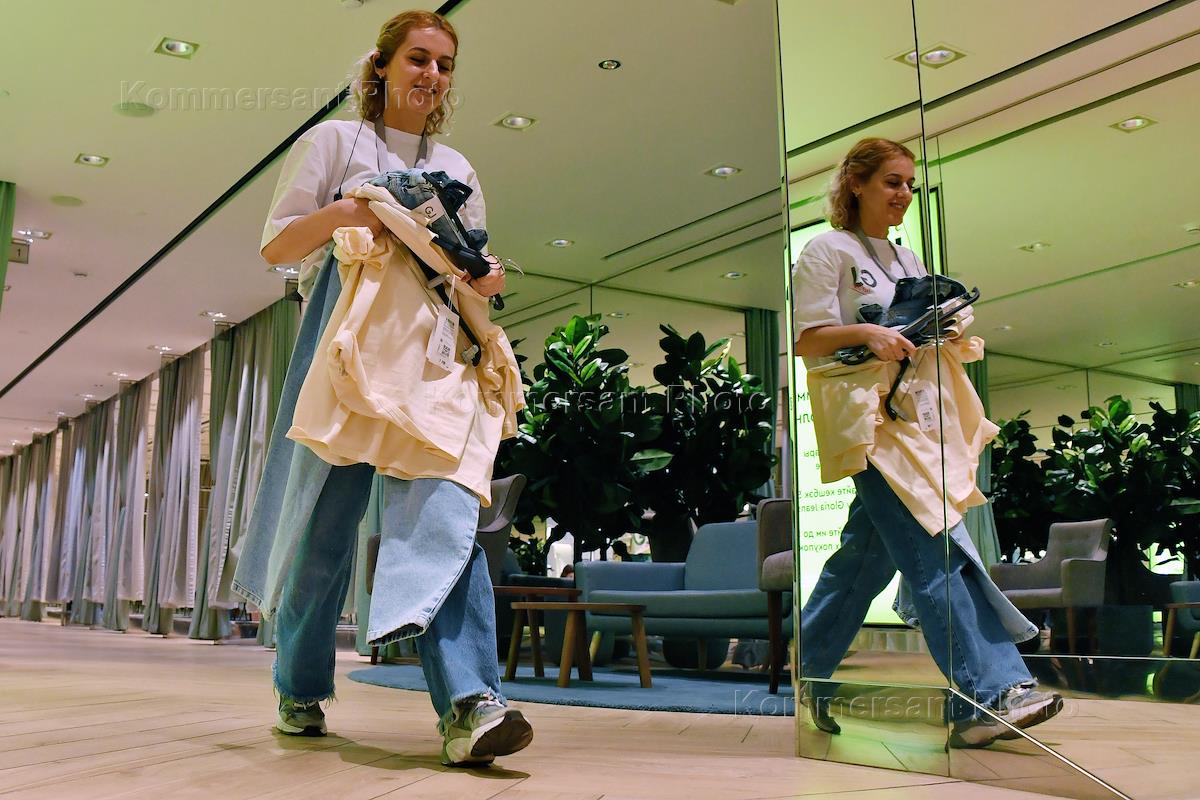 The operation of the Gloria Jeans store ("Gloria Jeans") on Tverskaya Street. Genre photography. Store employee in fitting room.