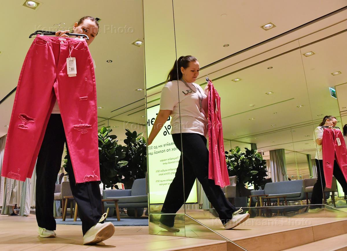 The operation of the Gloria Jeans store ("Gloria Jeans") on Tverskaya Street. Genre photography. Store employee in fitting room.