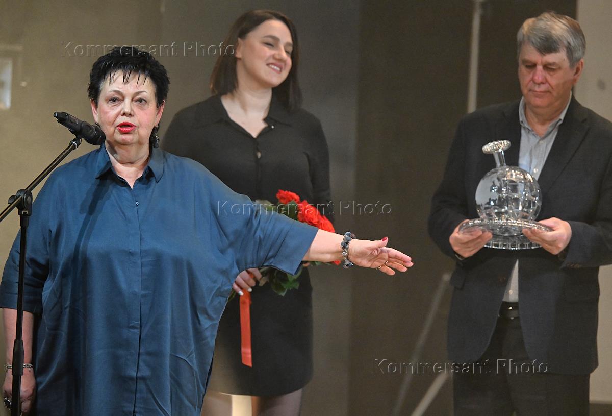 XXI церемония награждения победителей Московской ежегодной театральной премии Союза театральных деятелей (СТД) России "Гвоздь сезона" 2023 года в Театральном центре "На Страстном". Слева направо: начальник отдела перспективного планирования и специальных проектов Государственного академического Большого театра (ГАБТ) Ирина Черномурова, оперная певица Анна Шаповалова и главный хормейстер ГАБТ Валерий Борисов на церемонии.