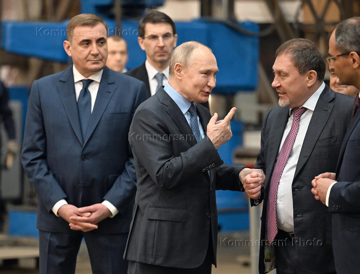Рабочая поездка президента России Владимира Путина в Тулу. Слева направо: губернатор Тульской области Алексей Дюмин, полномочный представитель президента России в Центральном федеральном округе Игорь Щеголев, президент России Владимир Путин, генеральный директор ООО "ПромТехКом", член совета директоров АО "Тулажелдормаш" Александр Силкин и генеральный директор АО "Тулажелдормаш" Артем Асатрян во время посещения завода "Тулажелдормаш".