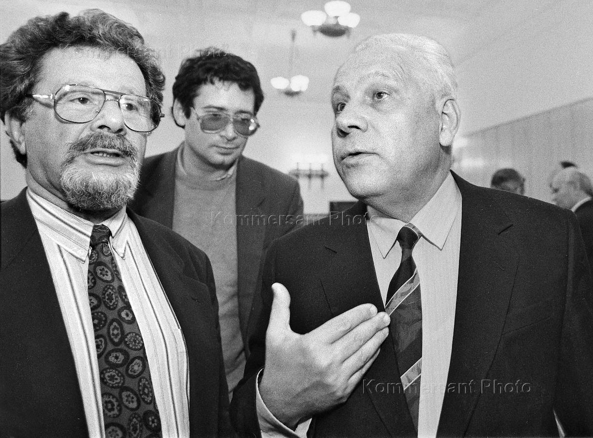 Продолжения суда над членами Государственного комитета по чрезвычайному положению (ГКЧП) в Верховном Суде России. Депутат Государственной думы России Анатолий Лукьянов (справа), адвокат Генрих Падва (слева) перед началом заседания суда.