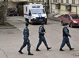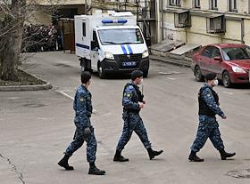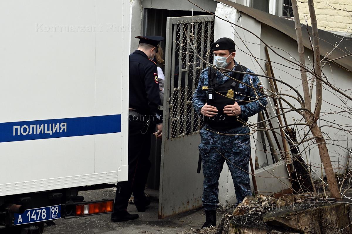 Selection of a preventive measure for Darya Trepova, who was detained on suspicion of involvement in the explosion at the Street Bar cafe in St. Petersburg and the murder of war correspondent Vladlen Tatarsky, in the Basmanny District Court. Genre photography. Employees of the Bailiff Service in the court yard.