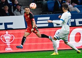 Фонбет - Кубок России по футболу 2022/23. Матч между командами "Динамо" (Москва) - "Акрон" (Тольятти) на стадионе "ВТБ Арена". Игрок команды "Динамо" Саба Сазонов (справа) во время матча.