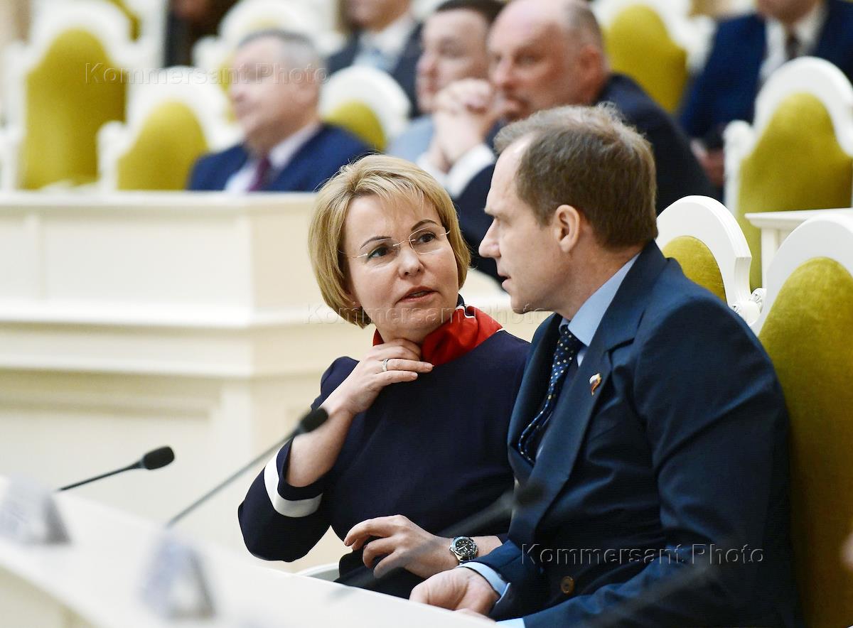 Ежегодный доклад Уполномоченного по правам ребенка в Санкт-Петербурге Анны Митяниной по итогам 2022 года на пленарном заседании Законодательного Собрания Санкт-Петербурга. Уполномоченный по правам ребенка в Санкт-Петербурге Анна Митянина (слева) и представитель в Совете Федерации (СФ) России от законодательного (представительного) органа государственной власти Санкт-Петербурга Андрей Кутепов (справа) во время заседания.
