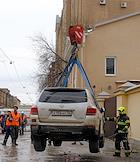 Сотрудники спасательной службы во время эвакуации автомобиля с тротуара после прорыва трубы и размыва дорожного полотна по улице Дровяная, д. 6