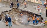 Последствия прорыва трубы и размыва дорожного полотна на улице Дровяная. Сотрудники коммунальных служб во время ликвидации аварии.