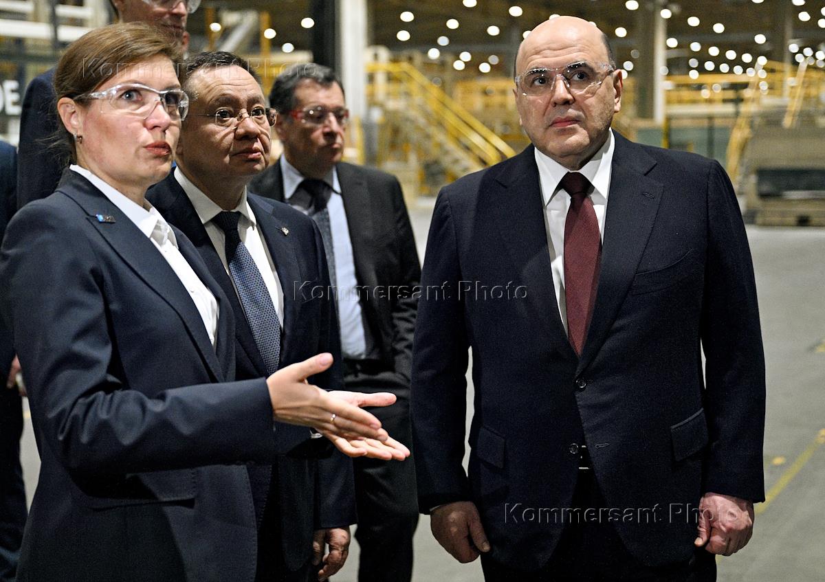 Рабочая поездка председателя правительства России Михаила Мишустина в Рязань. Председатель правительства России Михаил Мишустин (в центре) во время посещения стекольного завода "Ларта Гласс Рязань".
