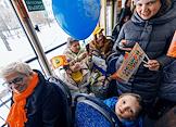 XIX Международный "Смешной фестиваль". День Витамина С. Артисты клоун-мим-театра "Мимигранты" и пассажиры в салоне трамвая № 6 во время "Витаминно-трамвайного флешмоба" для создания "оранжевого" настроения.