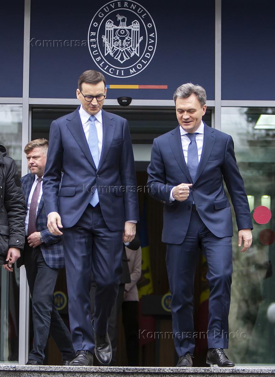 Премьер-министр Молдовы Дорин Речан (справа) и премьер-министр Польши Матеуш Моравецкий (слева) во время встречи.