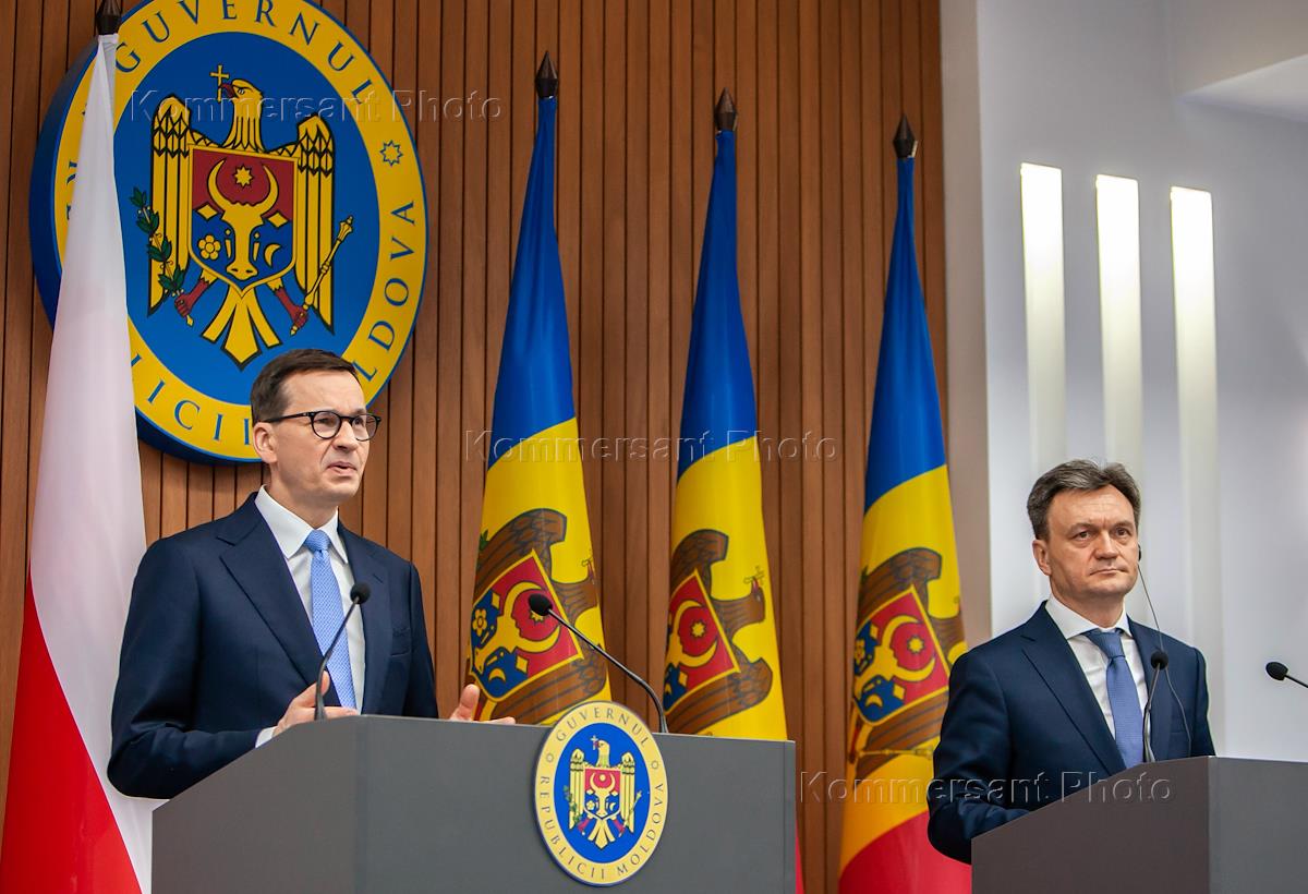 Премьер-министр Молдовы Дорин Речан (справа) и премьер-министр Польши Матеуш Моравецкий (слева) во время пресс-конференции по итогам встречи.